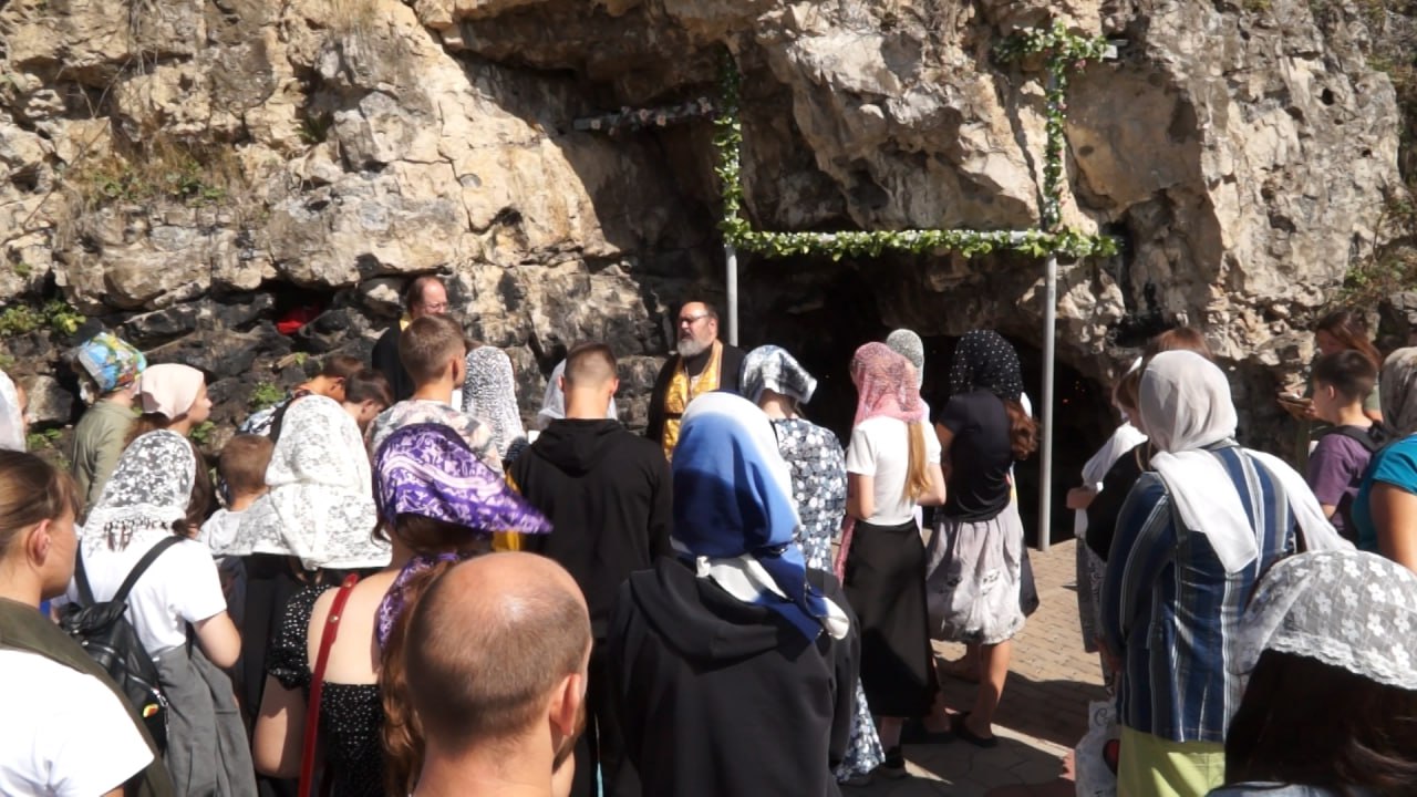 Прибыв на место мы сразу направились к святой пещерке, где было явление иконы. У пещерки мы горячо помолились и попросили Матушку о заступничестве. Отец Георгий рассказал о чудесах, о путешествии по свету Табынской иконы, а также историю обретения. Первое явление Табынской иконы Божией Матери произошло, скорее всего между 1594 и 1597 годом, как гласит предание: Иеродиакон Амвросий шел вечером с сенокоса. И проходя мимо соленого источника, услышал голос: «Возьми Мою икону». Но, считая эти слова наваждением, постарался не обратить внимания. На третий день проходя там же он снова услышал неземной глас: «Да потщится правоверная братия, богоспасаемой обители прияти Мя во храм Господа Моего». Он осмотрелся и увидел на большом камне в тени большого дерева икону Божией Матери. Камень был действительно большим, около 3-х метров в высоту и ширину. Этот камень нависал над двумя источниками один из которых был соленый, другой пресный. Диакон поклонился иконе и побежал в монастырь. Братия с честью и пением принесли икону и поставили ее в храме. Но на утро иконы не обнаружили. Стали искать и увидели ее на монастырских вратах. Монахи снова вернули икону в храм, но утром она опять была на прежнем месте. Тогда они решили, построить над вратами часовню там стали молиться ей. Дальше произошло новое явление Табынской иконы. Как говорит сказание: «Пречистая икона была перенесена братией в монастырь. И была носима и в Казань и в Уфу, но как бы не обретшая там себе места, она снова явилась на камне и снова была поставляема в монастырь» Это стало известно царю Федору Иоанновичу, и он даровал новые земли, на которых архиепископ Гермоген основал монастырь «Пречистенский».